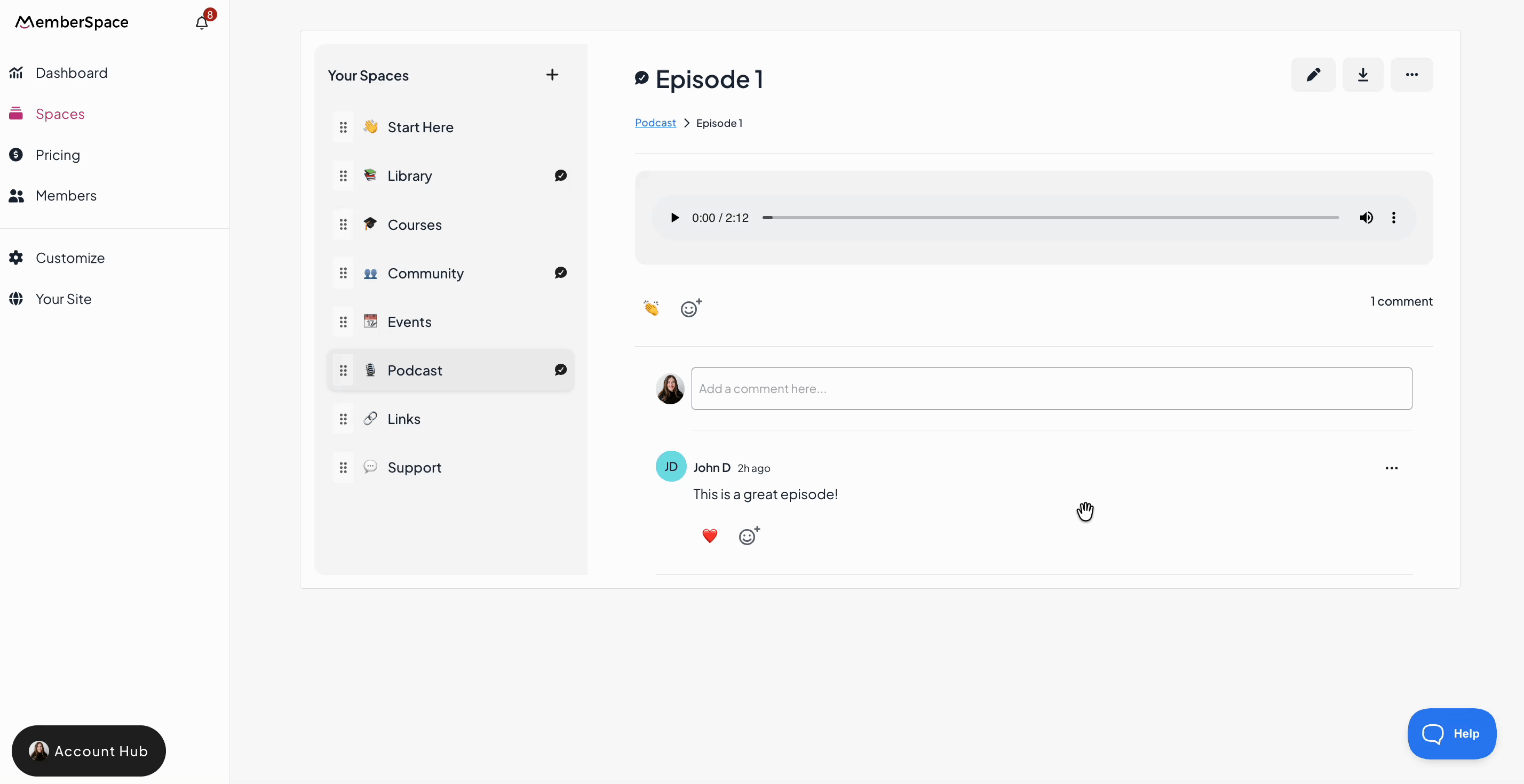 Comments and reactions are enabled at the space level first, then turned on for individual content items within that space. This gives you flexibility to decide which areas of your MemberSpace support interaction and which remain read-only.
